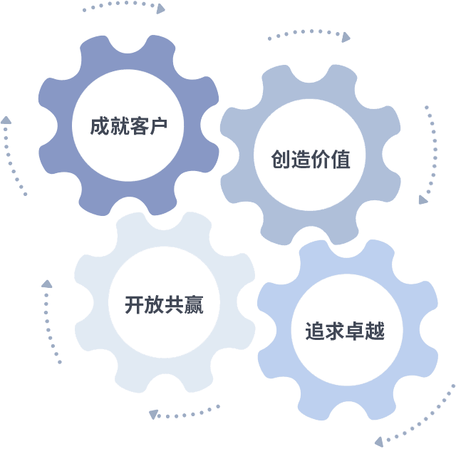 成就客户是一切决策的出发点,,,,创造价值是衡量所有工作的标准,,,,追求卓越是我们做事做人的态度,,,开放共赢是我们的格局也是最终的结果。。。。价值观的齿轮环环相扣,,,推动着组织里的每个人不断向前。。。。