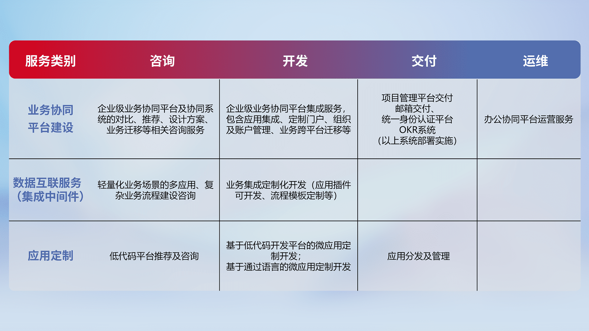 针对钉钉、、、企微、、、、IDaas等平台级产品提供产品的规划、、、、方案、、、交付、、、、定制化开发等服务,,实现如统一协同办公、、、、智能客户服务、、、、混合会议管理、、、、智能数据查询、、、、等业务场景,,,,实现数字化转型。。。。