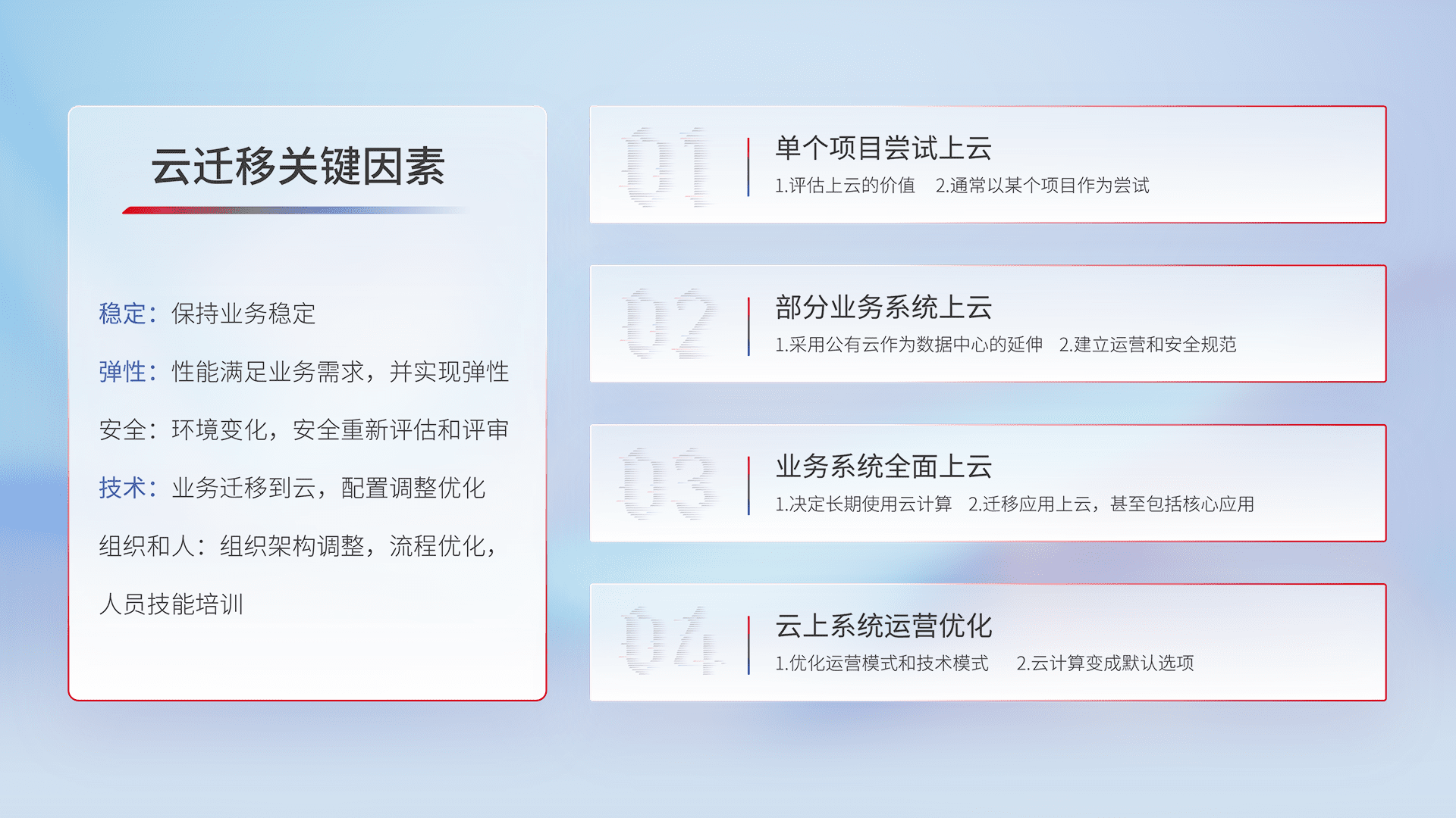 结合实际业务,,,,从规划设计、、云平台选型、、云原生改造、、、、数据迁移、、、集成交付,,迁移全过程为客户识别最佳上云路径,,,做好风险识别管理,,,,设计网络架构、、身份权限、、安全审计合规、、操作审计、、日志审计、、监控告警策略、、、多站点容灾设计等,,对云上基础设施进行整体规划,,提升IT治理水平,,以满足弹性、、、、高可用、、高性能的需求。。