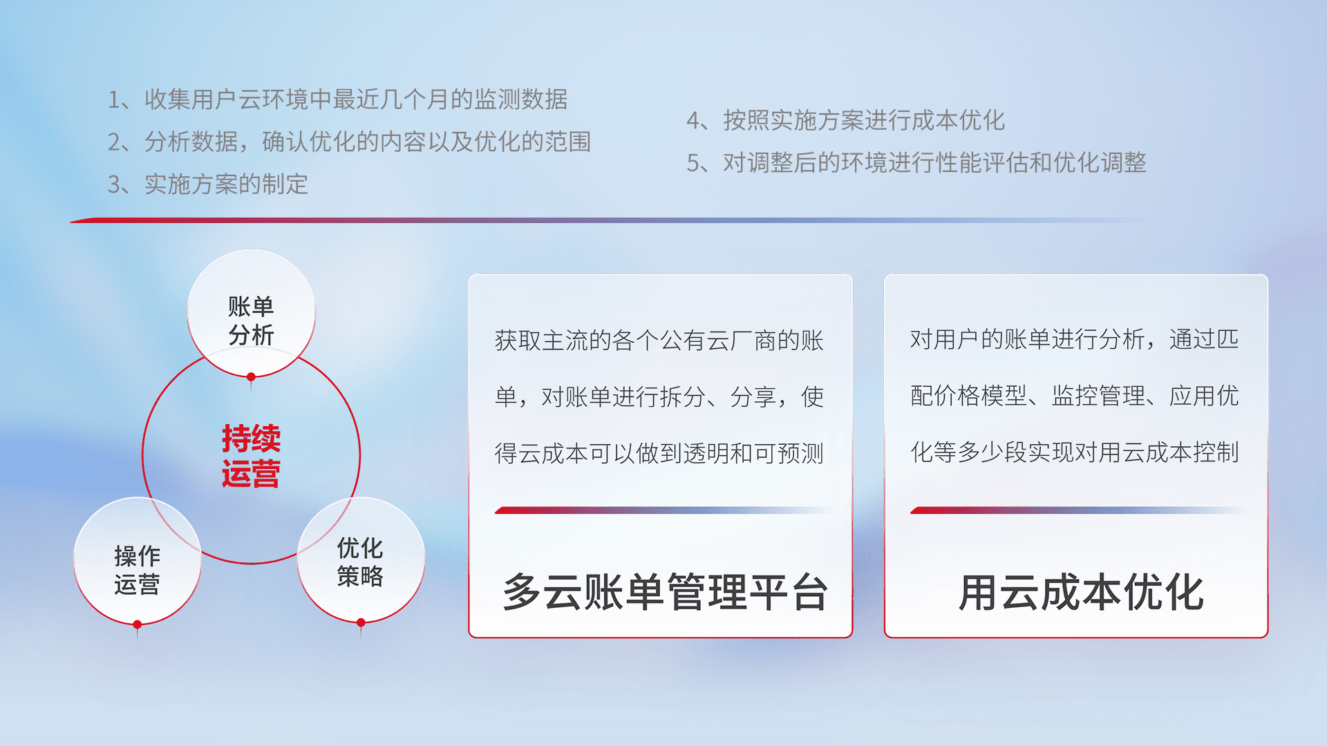 通过多云纳管,,,,以统一的资源数据模型把客户的云资源进行抽象和封装,,,进而实现对多云资源的统一操作,,,,保障云资源管理的可靠性、、稳定性与可用性。。。量身定制化运维内容,,,配置、、开发运维、、、补丁管理、、、备份、、、监控、、认证和访问管理、、、审计和日常巡检等,,保障在用云过程中的可靠度,,,稳定度以及高可用率。。